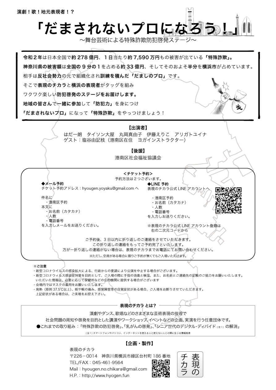 上記リンクアドレスをクリックして下さい。LINEが起動しますので、【表現のチカラ】のアカウントを登録していただき、そのまま①「戸塚区」予約②お名前(カタカナ)③人数④電話番号を入力し、送信して下さい。